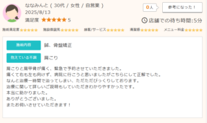 初めてのご来院とのことでしたが、「丁寧なカウンセリングで安心できた」「施術後に肩や腰が驚くほど軽くなった」とのお言葉、大変うれしく思います。